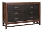 The Branson 6-drawer Dresser delivers a unique and modern interpretation of Arts and Crafts style. Constructed from Pine Solids and Pine Veneers, this dresser boasts a Two-Tone Rustic Buckeye and Black Finish complete with Antique Brass Hardware. Featuring felt-lined jewelry and top drawers, a stretcher base, shutter slat and unique mitered framing details, this dresser will provide ample storage for clothing and jewelry and make a striking addition to your main or spare bedroom. Fully assembled upon arrival, this piece from Bridgevine Home is ready to unbox and enjoy.